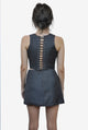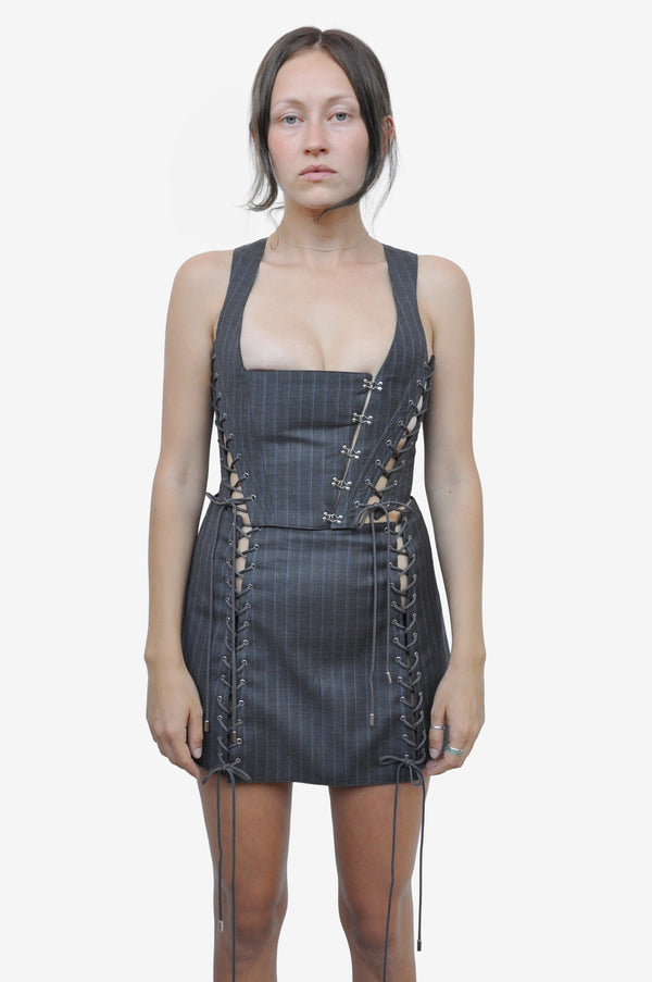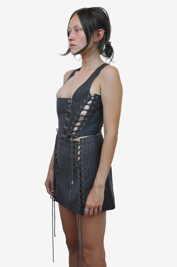 The Majesty corset is crafted from wool flanelle, offering a refined balance of structure and softness. Designed for an adjustable fit, it features lace-up detailing along the sides and back for elegant, personalized shaping. A silver metal hook closure highlights the front, while light boning gently defines the silhouette.
