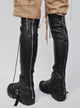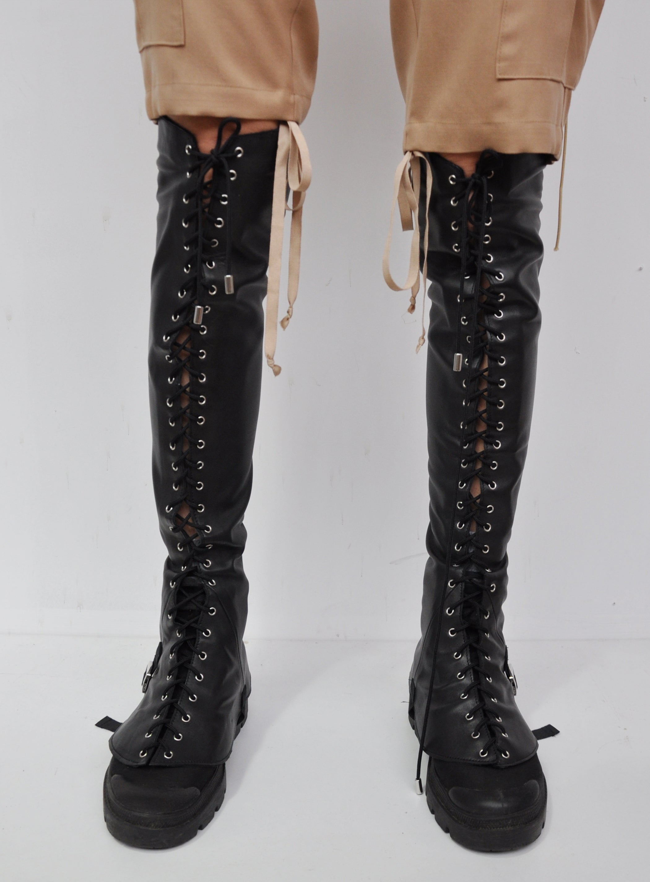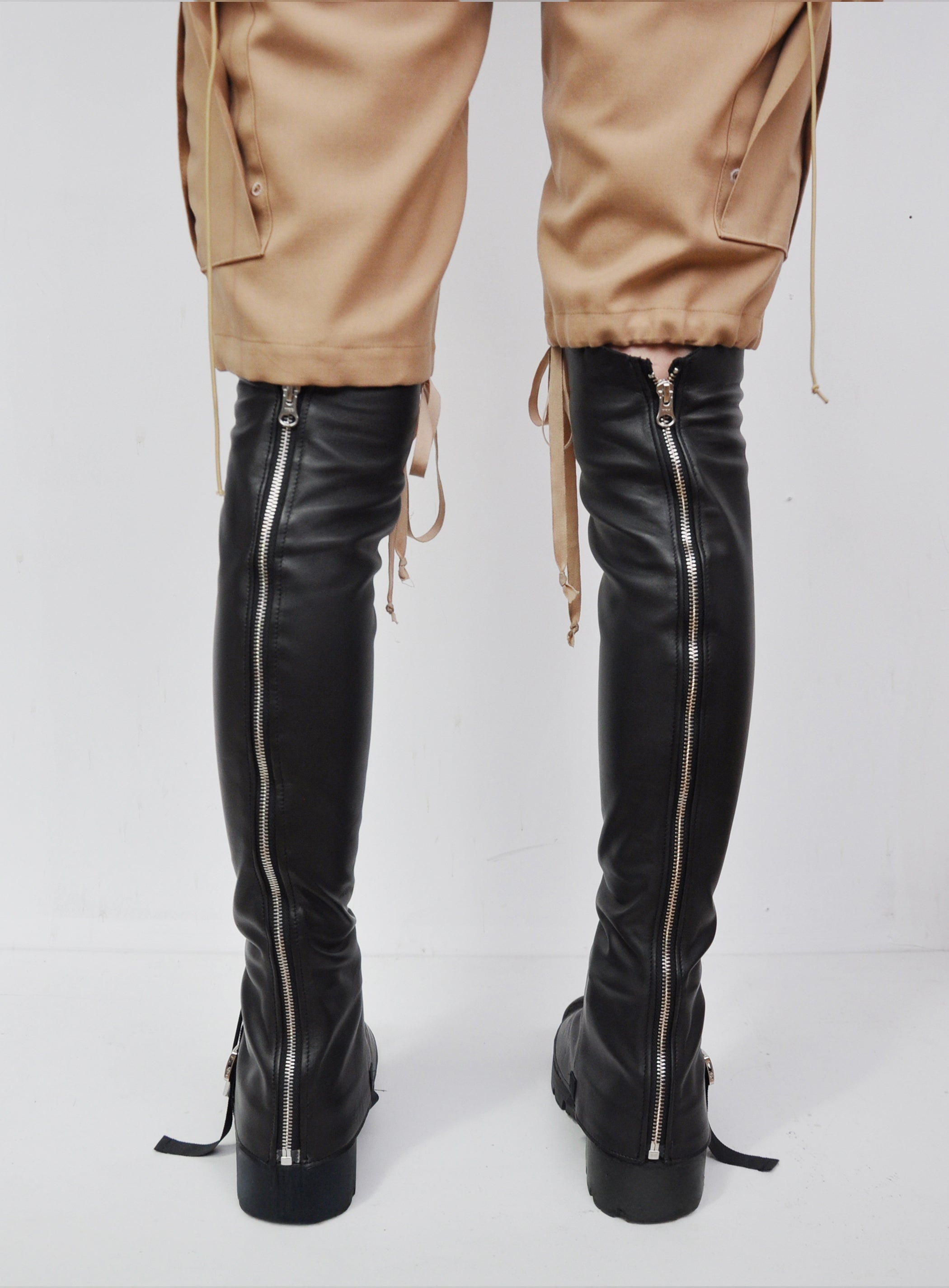 The leather-laced gaiter is handcrafted in France using luxurious lambskin sourced from deadstock materials of renowned fashion houses. Made through traditional artisanal leatherworking techniques, it draws inspiration from a fusion of corsetry and high-mountaineering gaiters. The design features a silver metal zipper at the back for both aesthetic appeal and easy fastening.